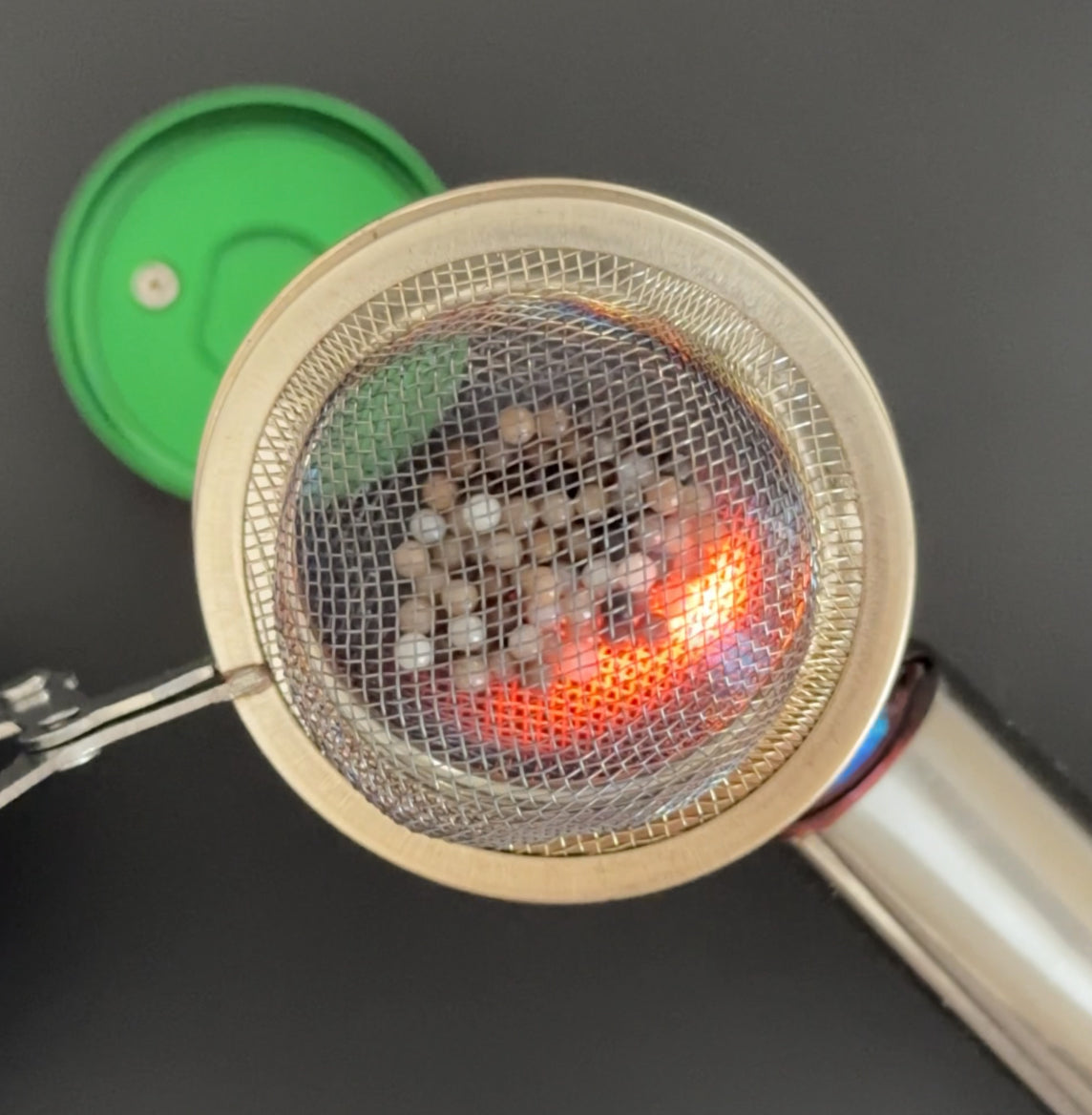 Periodically, you might want to deep clean the balls within the Cap. First, remove them and place the balls into a mesh tea strainer. Heat them repeatedly with a medium or large torch until they are clean. Be careful with the glass balls; don't heat them to extreme temperatures. Prepare a safe place for the tea strainer with the balls to cool down, which can take a few minutes.