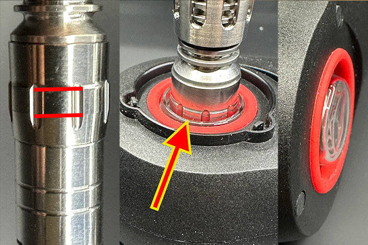After installing the adapter following the video guide below, gently press it down with your Tempest until the area marked within the two red lines on Cap is at the top of the Wand's glass. We recommend adjusting it within the marked range on the cap in relation to the top of the glass to avoid heating too low or too high. Initially, adjust it to the middle, as shown in the picture.