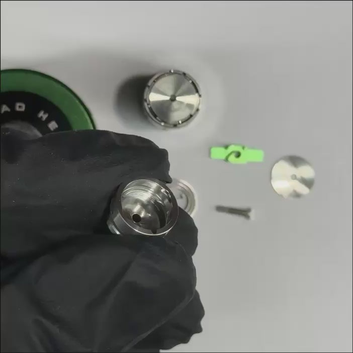 Soak the assembled device, excluding the wood sleeve, in 99% isopropyl alcohol for at least 30 minutes using a zip-lock bag, shaking it periodically to ensure a thorough clean. Drain the solution, rinse all parts in the bag with warm water, then soak again in IPA and shake for another minute to remove any leftover residue. Rinse again thoroughly under hot water. Dry all parts completely before reassembling. The cap, including the indicators and balls, can be submerged in cleaning solutions; however, it must be dried as soon as possible by shaking out the remaining liquid and heating the cap once with an empty bowl. We recommend wiping most parts with a Q-tip dipped in IPA (isopropyl alcohol) and performing periodic ball cleanings.